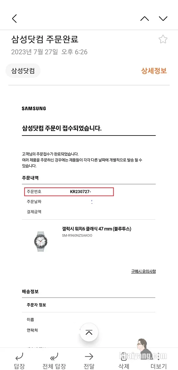 메일이 아닌 삼성닷컴에 들어 가셔서 주문 항목에서도 확인을 할 수 있습니다.