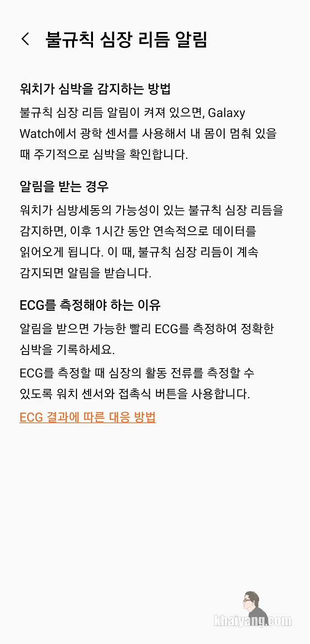 ECG 항목에 워치가 불규칙 심장 리듬을 감지하면 알림을 받습니다 항목을 활성화 합니다. 이 외에도 ECG 결과 알림도 활성화 시켜주는 것이 좋습니다.
