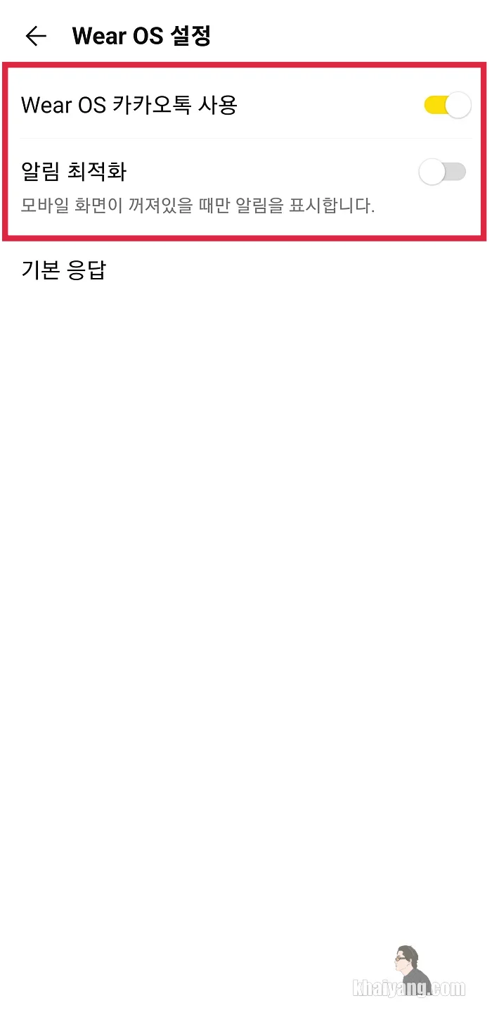 Wear OS 카카오톡 사용을 활성화 시키고 그 아래있는 알림 최적화는 꺼주세요.