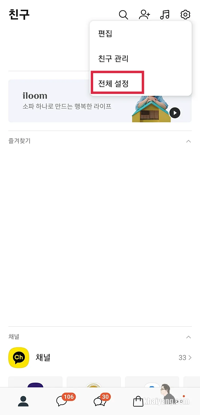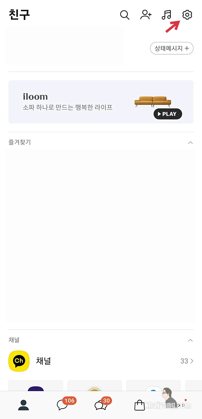 스마트폰에서 카카오톡 앱을 실행한 후에 상단 오른쪽에 있는 톱니바퀴를 터치 합니다.