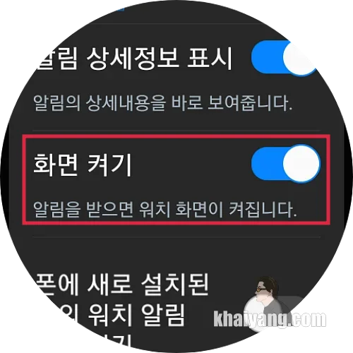 이 항목을 선택 하시면 알림을 받는경우 워치 화면이 켜져서 바로 알림 내용을 확인할 수 있습니다.