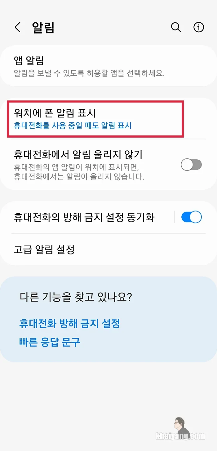 워치에 폰 알림 표시 항목에서 휴대전화를 사용 중일 때도 알림 표시 로 선택을 합니다.