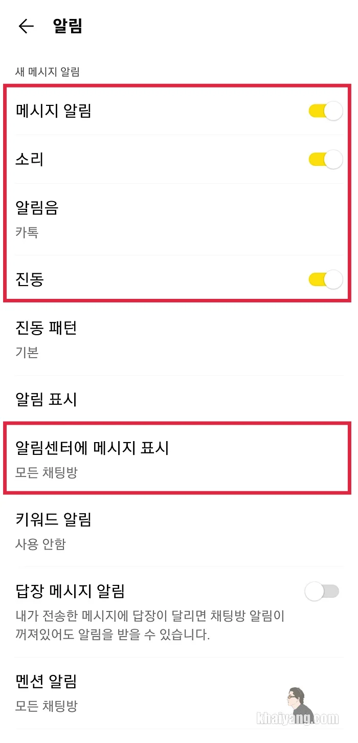 이 부분에서 메시지 알림과 소리, 진동 항목을 켜주세요. (노란색으로 활성화)