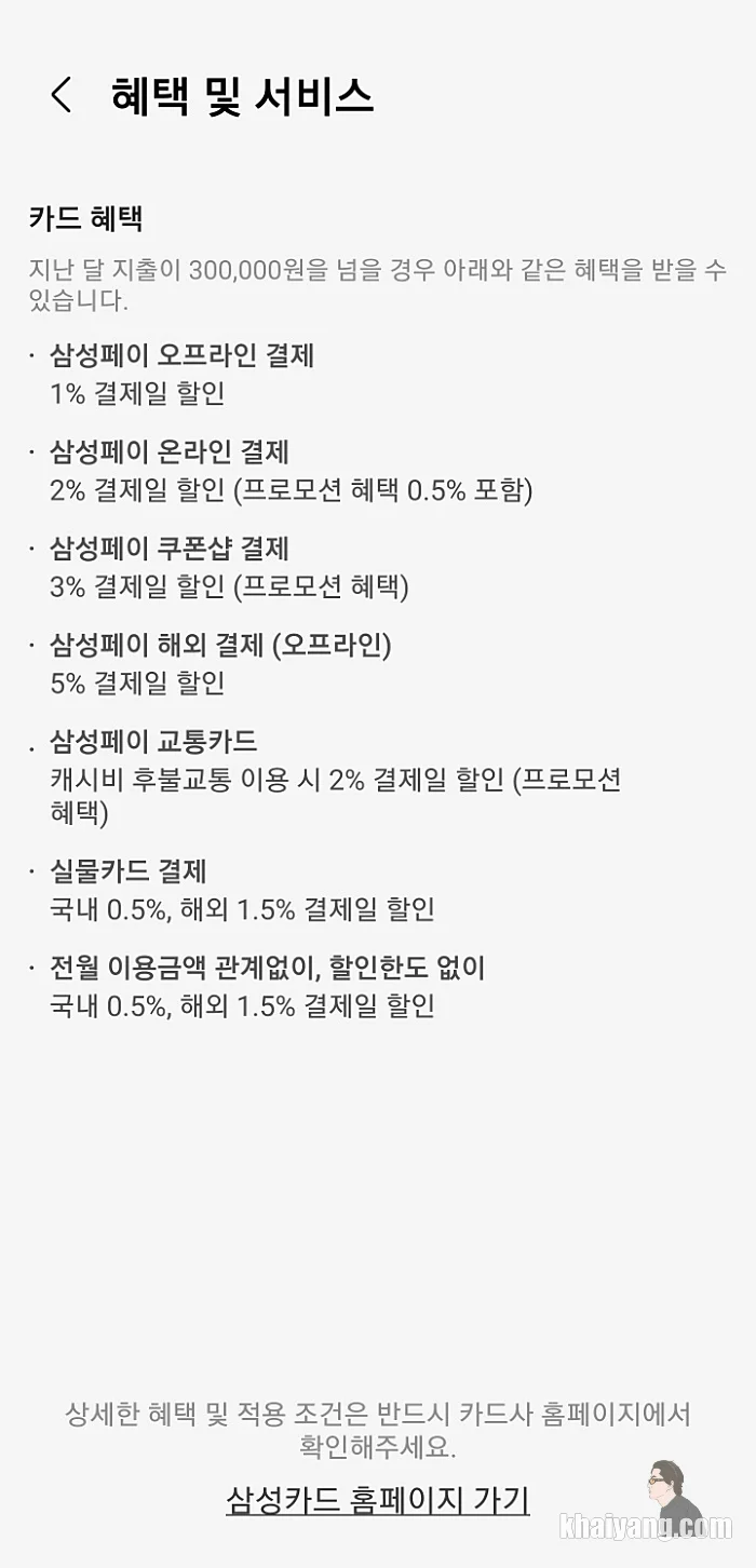 제가 삼성페이를 일부러 쓰려고 했던 이유는 제가 사용하는 삼성페이 카드 같은 경우 해외에서 오프라인 결제시에 5% 결제일 할인이 진행중에 있기 때문입니다.