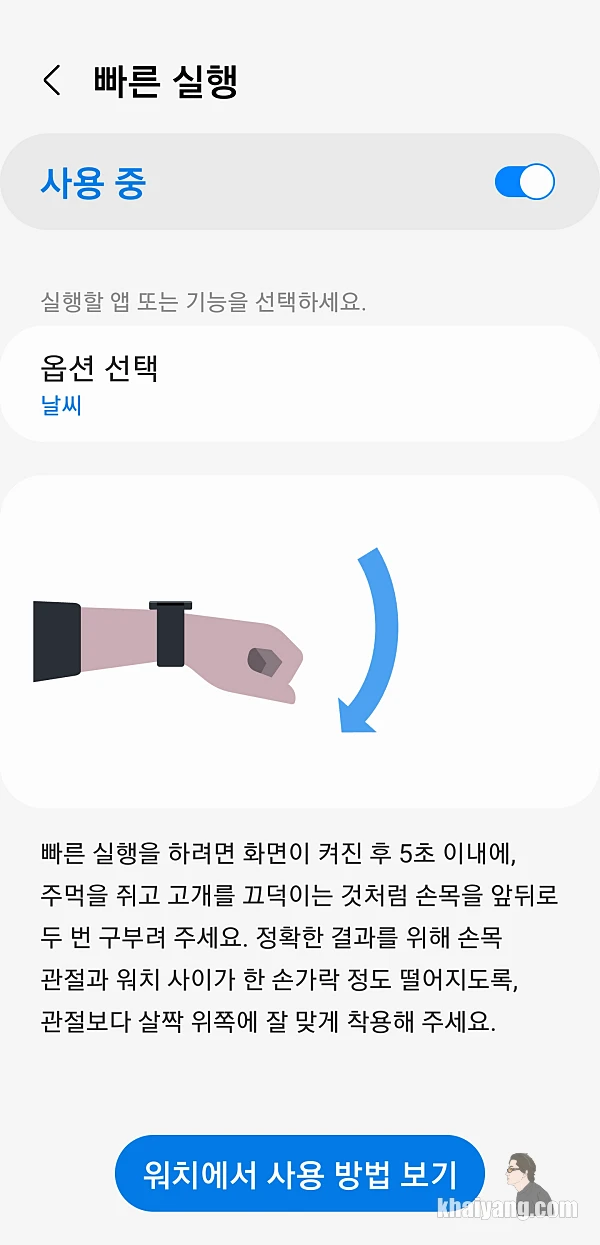 다만 다른점 이라고 하면 더블탭은 검지와 엄지를 두 번 탭하는 손가락 작동인데, 갤럭시워치는 손가락이 아닌 손목을 움직이는 동작으로 기능을 제어할 수 있습니다.