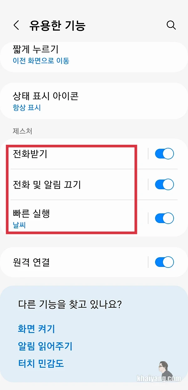 유용한 기능의 제스처 항목을 보면 전화받기, 전화 및 알림 끄기, 빠른 실행 등 세가지 기능을 더블탭과 유사한 모습으로 사용할 수 있습니다.