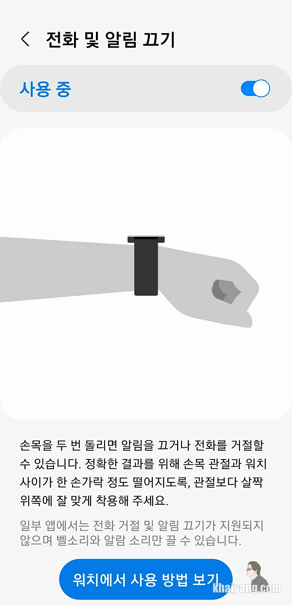 전화 및 알림 끄기 기능을 손목을 두번 돌려서 실행시킬 수 있습니다.