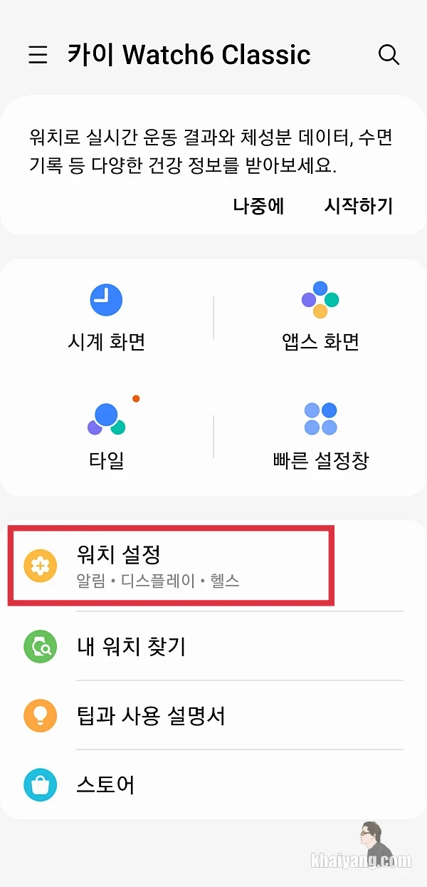 우선 갤럭시 웨어러블 앱을 열고 나서 워치 설정에 들어 갑니다.