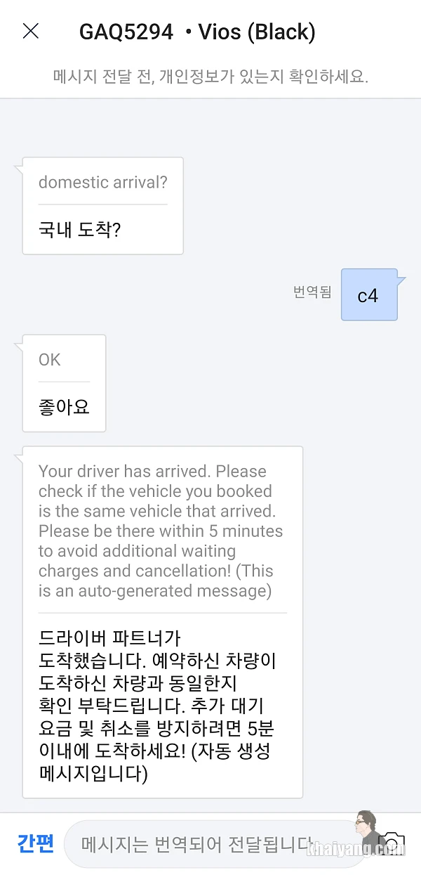 카카오T가 좋은 점은 이렇게 영어로 쓰면 한글로 바로 번역이 되서 나온다는 것 입니다. 저 같은 경우 기다리는 곳 위치가 영어로 표시된 곳이라서 별 다른 대화를 할 필요가 없었습니다.