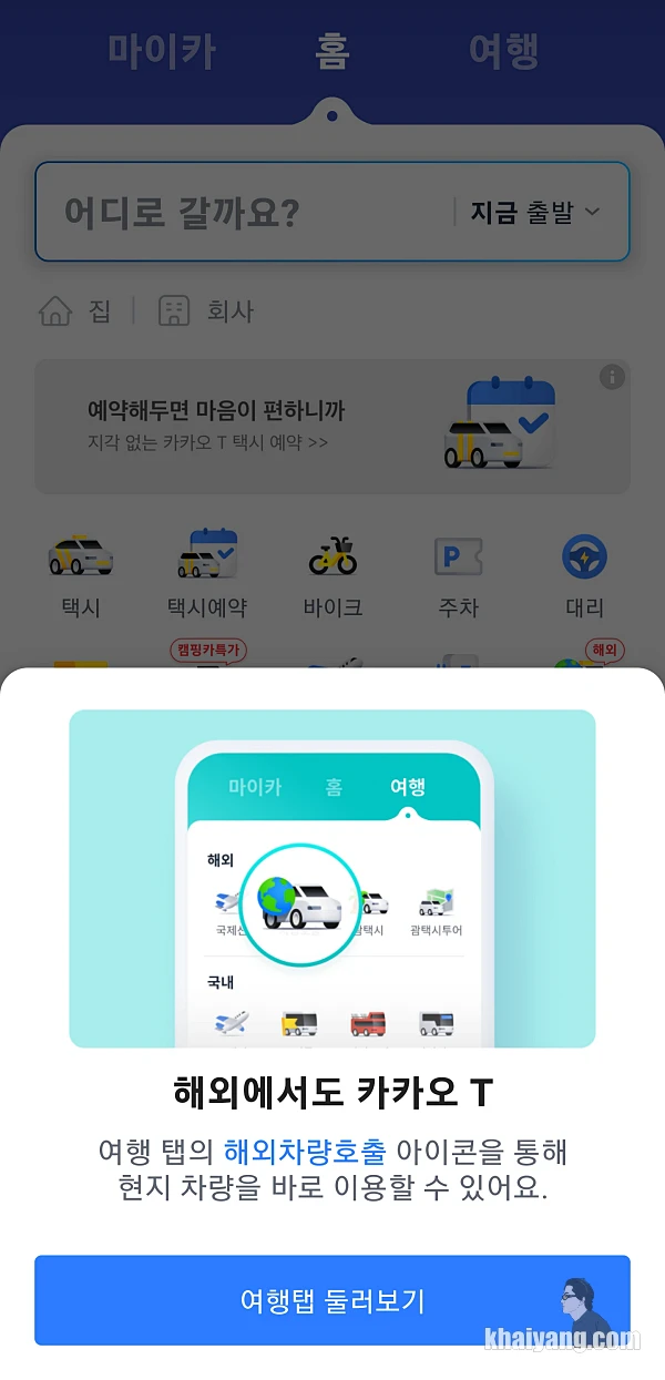 카카오T를 다운 받고 설치하고 실행하면 이렇게 팝업으로 해외에서도 카카오 택시를 이용할 수 있다고 알려 줍니다.