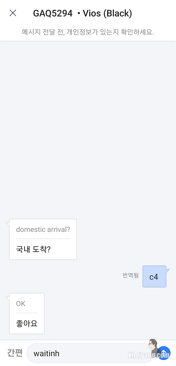 카카오T가 좋은 점은 이렇게 영어로 쓰면 한글로 바로 번역이 되서 나온다는 것 입니다. 저 같은 경우 기다리는 곳 위치가 영어로 표시된 곳이라서 별 다른 대화를 할 필요가 없었습니다.