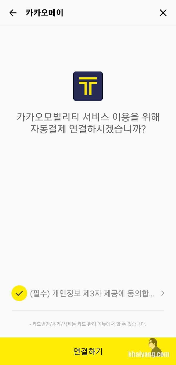 카카오T를 이용하기 위해서는 결제수단을 등록해야 합니다. 이용 카드를 등록해 놓으면 자동으로 결제가 됩니다.