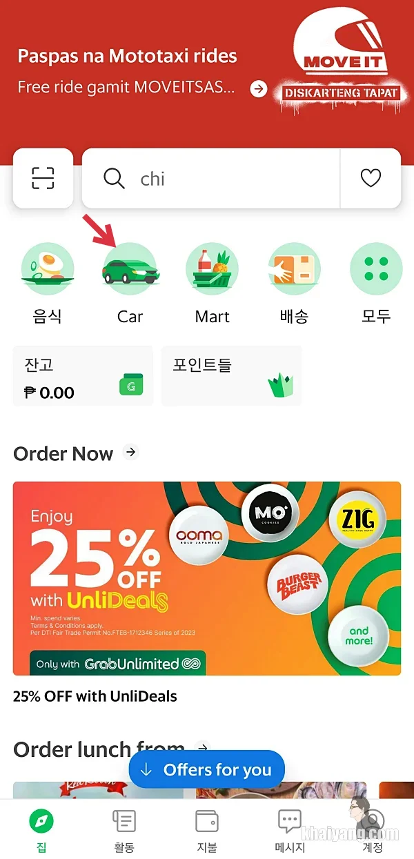 그랩을 열고 보면 상단에 Car 라고 표시 되어 있는 부분이 있는데 이 부분을 선택 합니다.