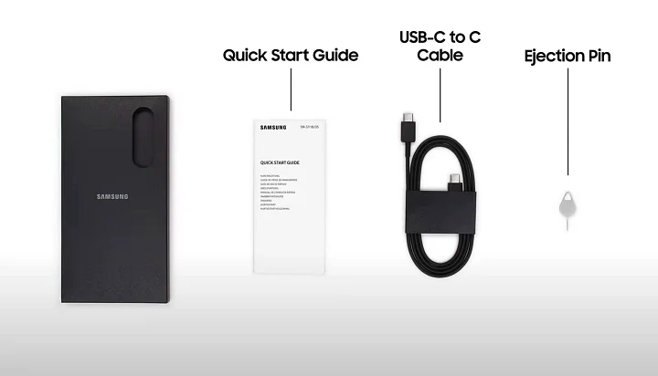 갤S23 FE 구성품은 퀵스타트 가이드, USB-C to C 케이블, 유심 분리 핀 이 들어있습니다. 이 구성품은 프리미엄이나 준프리미엄이나 모두 동일 합니다.