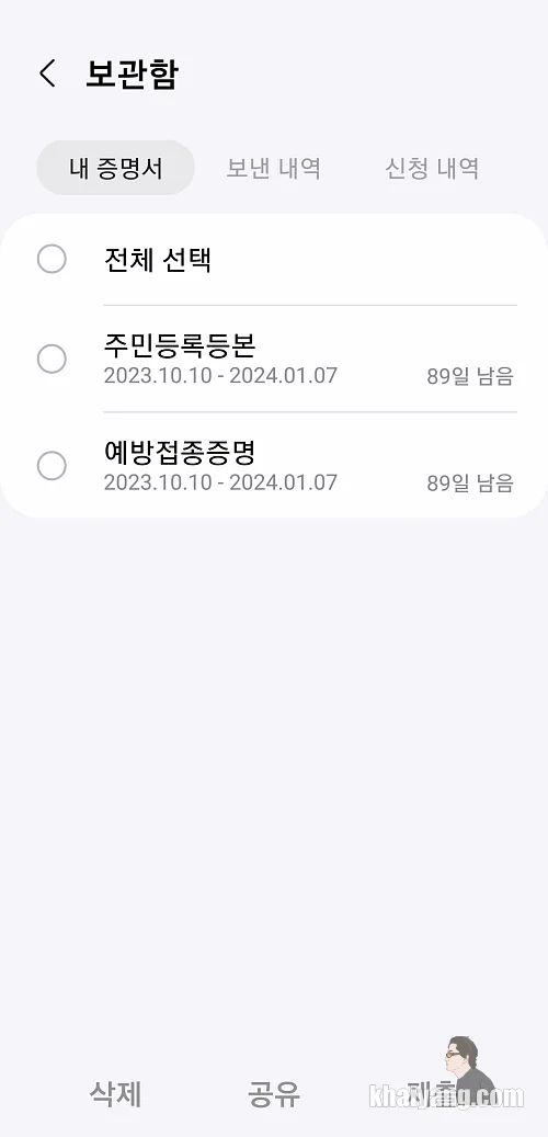 삼성페이 전자증명서를 열어보면 발급받은 증명서를 바로 확인할 수 있습니다.