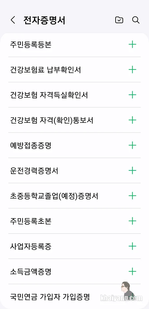 * 전자증명서 지원 11종(2023.10 기준) : 주민등록표등본(초본), 건강보험료 납부확인서, 건강보험자격득실확인서, 건강보험자격확인(통보)서, 예방접종증명서, 국민연금 가입자 가입증명, 운전경력증명서, 초중등학교 졸업(예정)증명서, 소득금액증명, 사업자등록증