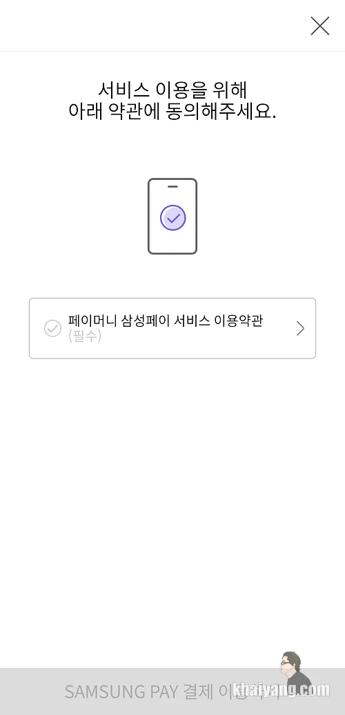 만약 삼성페이로 티머니페이를 쉽게 이용하고 싶다면 서비스 약관에 동의를 해주시고 이후에 나오는 부분을 다 선택해 주신후에 본인 인증 과정을 진행하면 됩니다.