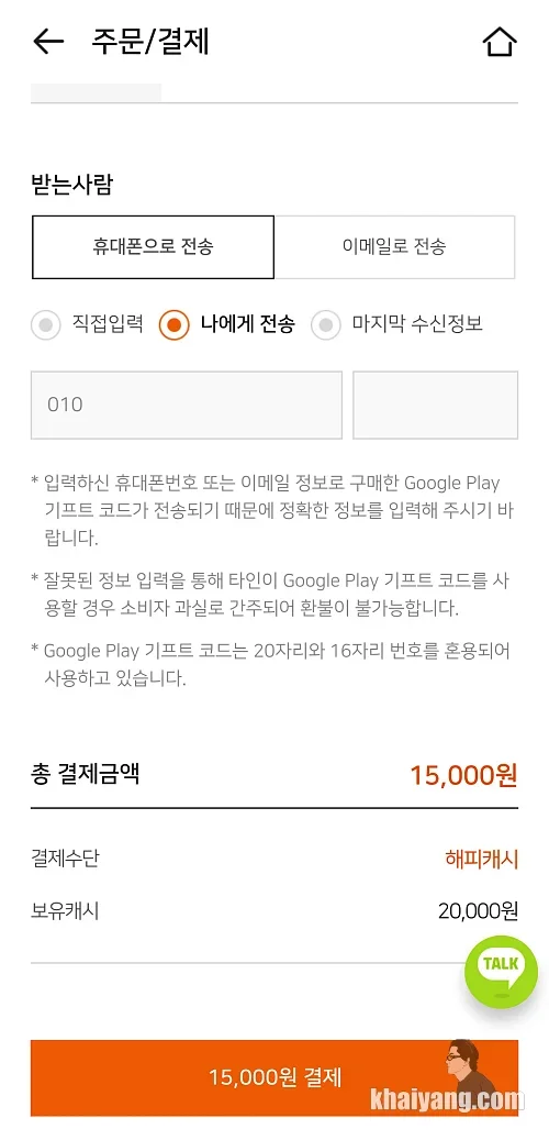 주문을 할때 받는 사람을 휴대폰 또는 이메일로 전송 중에 선택할 수 있습니다. 저는 편하게 휴대폰 그리고 저에게 보내는 것으로 했습니다.