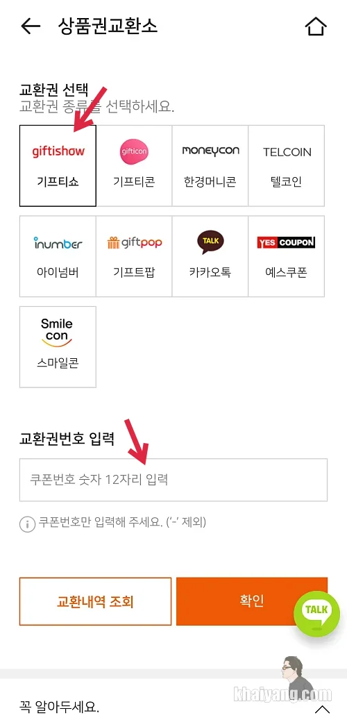 교환권 선택 부분에서 저는 기프티콘 항목을 선택 했습니다.