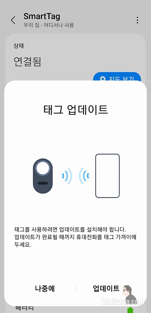 스마트태그 항목을 선택하면 업데이트 화면이 나오는데 하단의 업데이트 버튼을 눌러서 진행 합니다. 업데이트가 완료될 때까지 스마트폰을 태그 가까이에 두세요.