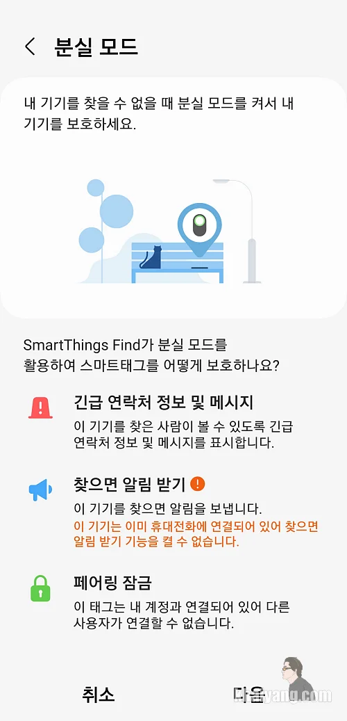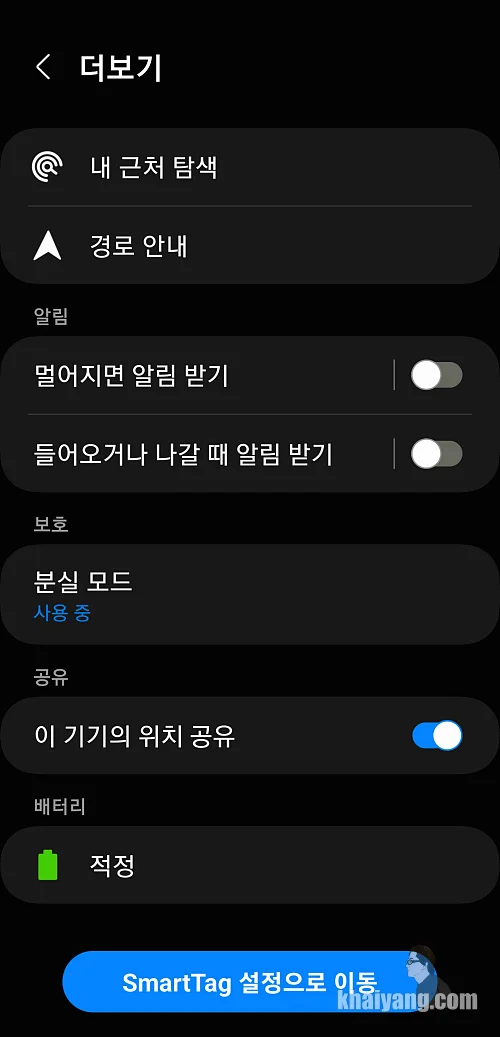 분실모드 등 위치 관련된 설정은 스마트 싱스 파인더에서 더 보기란을 눌러서 확인할 수 있습니다.