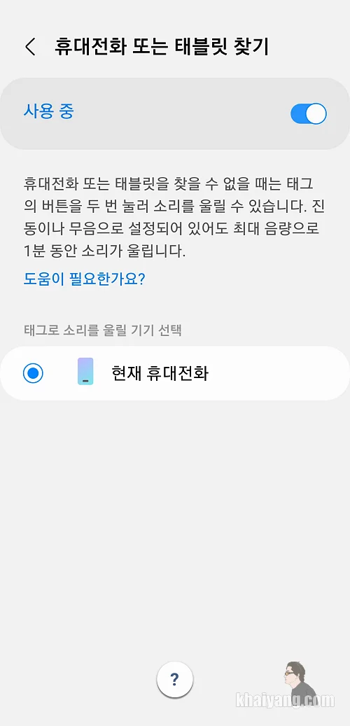 설정에서 휴대전화 또는 태블릿 찾기 기능이 있는데 이 부분을 활성화 시키면 태그 가운데 버튼을 두번 눌러 스마트폰을 쉽게 찾을 수 있습니다.