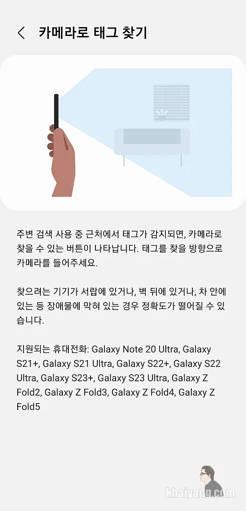 주변 검색중 근처에서 태그가 감지되면 카메라로 찾을 수 있는 버튼이 나옵니다. 이 기능을 사용하려면 모든 갤럭시 스마트폰이 되는 것이 아니고 밑에 나오는 모델에서만 가능 합니다.