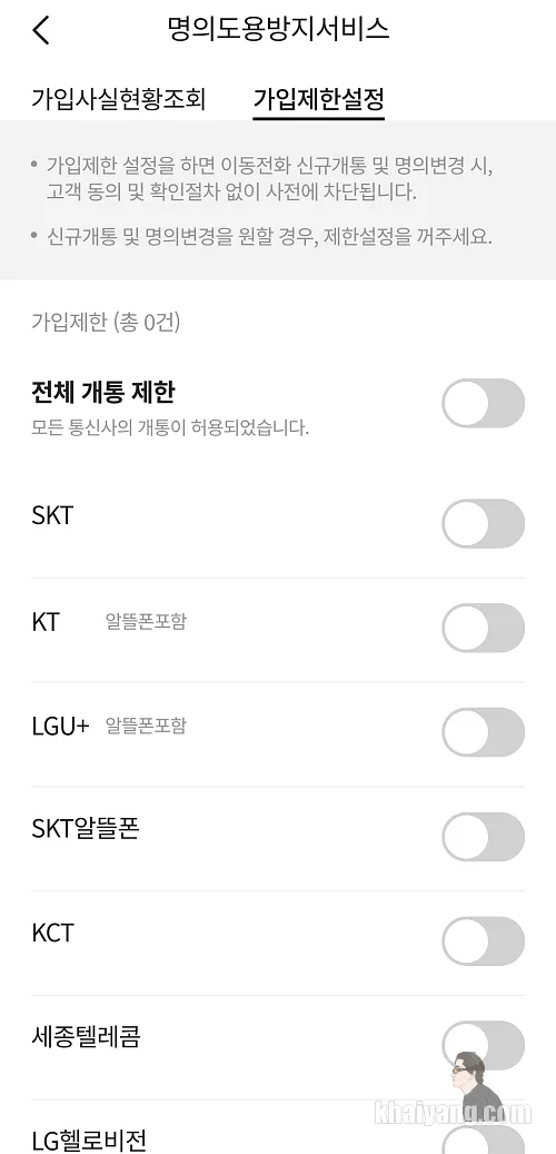 가입제한 설정을 하면 이동전화 신규개통 및 명의변경 시 고객동의 및 확인절차 없이 사전에 차단이 됩니다.