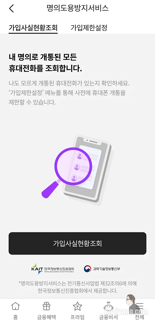 내 명의로 개통된 휴대전화가 있는지 한번 찾아 보겠습니다.