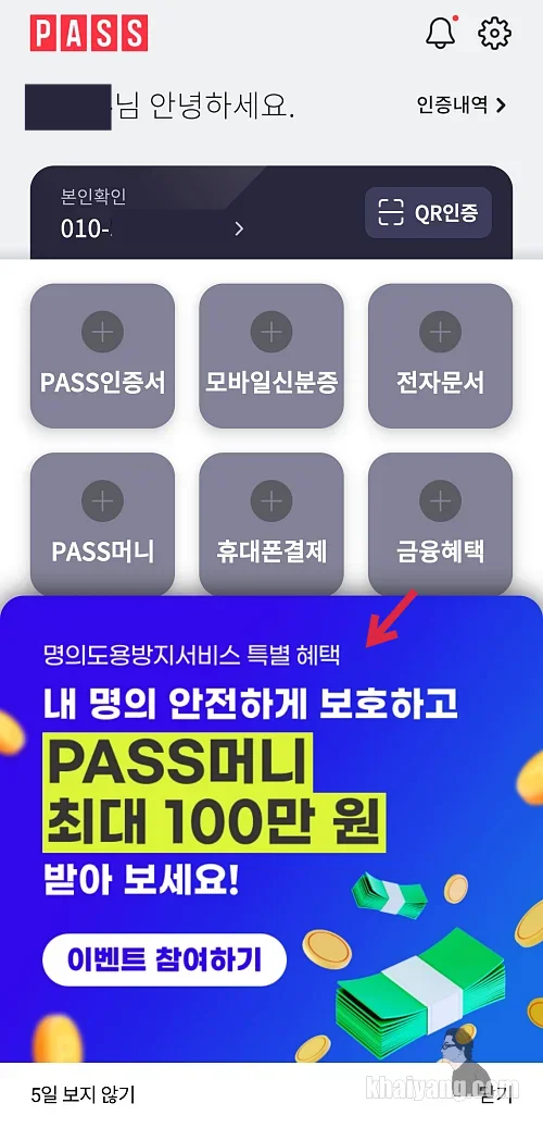 패스앱을 열어보니 마침 하단 팝업을 통해서 새로운 신규 서비스인 명의도용방지서비스 특별혜택 이벤트가 진행중에 있었습니다.