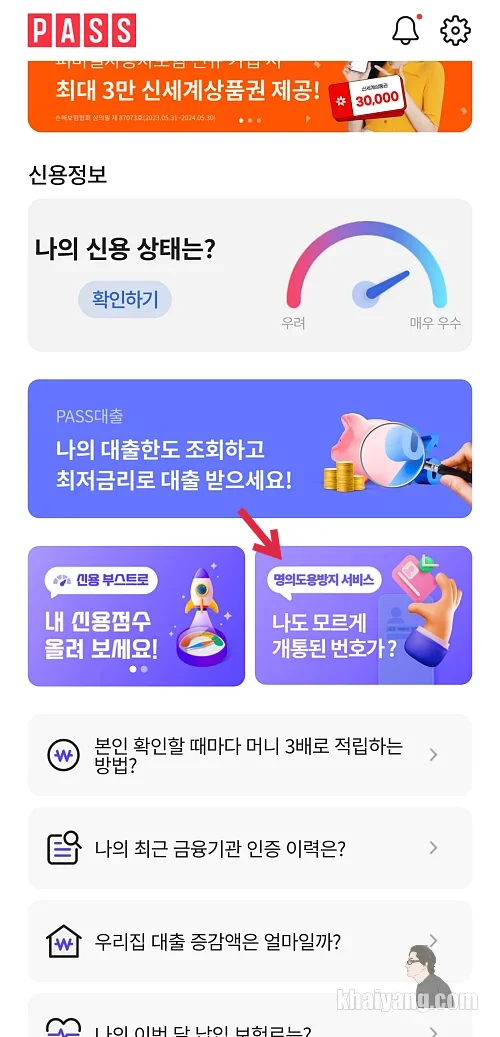 패스앱 메인 화면을 보면 화살표가 가리키는 부분을 선택해서 명의도용방지 서비스에 가입할 수 있습니다.