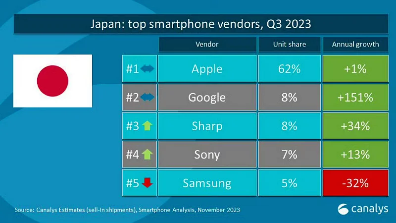 2023년 3쿼터 일본 스마트폰 점유율을 보면 구글이 151% 상승 하면서 애플에 이어서 2위로 뛰어 올랐습니다. 반면 삼성은 -32%를 기록하며 5위로 떨어졌습니다.