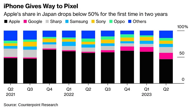 2023년 3쿼터 일본 스마트폰 점유율을 보면 구글이 151% 상승 하면서 애플에 이어서 2위로 뛰어 올랐습니다. 반면 삼성은 -32%를 기록하며 5위로 떨어졌습니다.