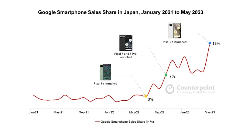 구글 픽셀 일본 점유율을 보니 픽셀6 출시 이후 출시 이후 빠르게 늘려 가고 있는데 픽셀7 성공의 영향이 큰 것 같습니다.