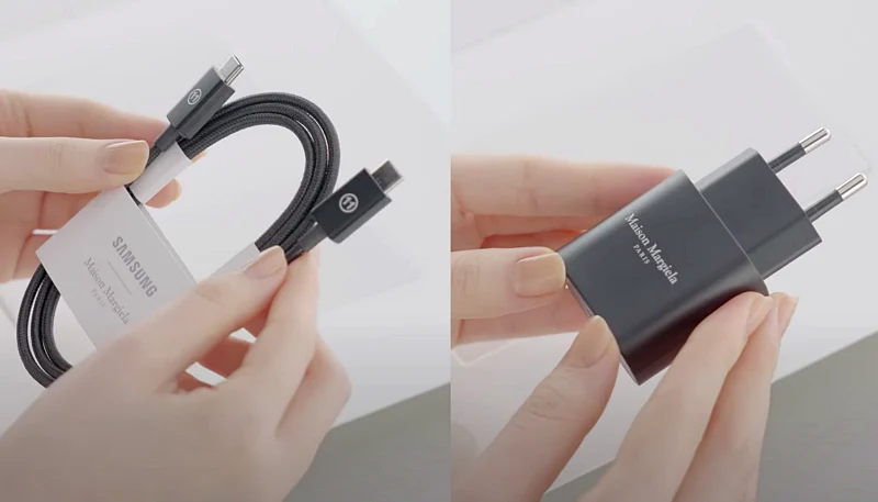 기존 갤럭시Z플립5 같은 경우 구성품에 달랑 충전/데이터 케이블만 제공해서 아쉬웠다면, 메종 마르지엘라 에디션은 메종 마르지엘라의 넘버링 디자인이 적용된 고속 충전기도 함께 제공하고 있습니다.