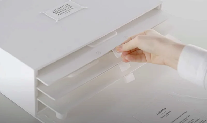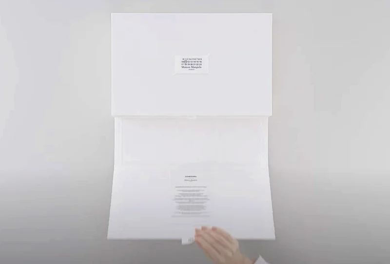 깔끔한 화이트 바탕의 케이스 곳곳에 메종 마르지엘라의 흔적이 담겨 있는데, 패키지 박스는 원단 질감의 종이 소재에 메종 마르지엘라 고유의 시침실을 표현했습니다.