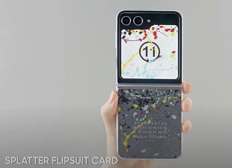 메종 마르지엘라 고유의 페인트 드롭 디자인 카드와 넘버링이 새겨진 실버 카드의 NFC 기술로 갤럭시 Z 플립5의 커버 스크린 '플렉스 윈도우'에 차별화된 테마를 선보이는 것이 특징입니다.