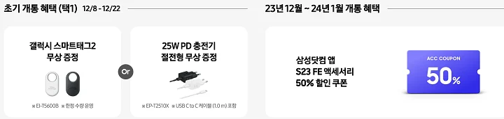 이외에 갤럭시S23 FE 를 구매했을 경우 공통으로 받을 수 있는 사은품은 갤럭시 스마트태그2 무상증정 또는 25W PD 충전기 절전형 무상 증정중에 선택할 수 있습니다.