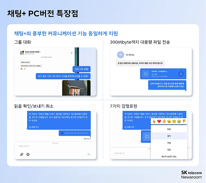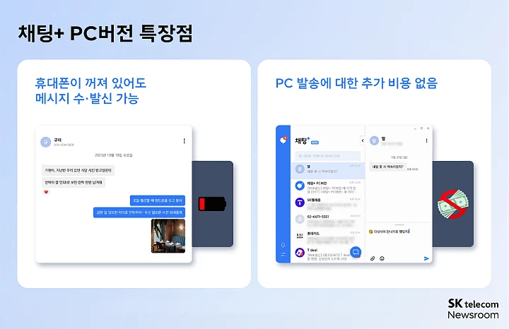 SK텔레콤은 모바일과 PC에서 일관된 메시징 서비스를 제공하기 위해 ‘채팅플러스(채팅+) PC 버전’을 정식 출시한다고 12일 밝혔습니다. 채팅플러스는 세계표준인 RCS 규격에 맞춰 이동통신3사가 삼성전자와 함께 제공하고 있는 문자 서비스 입니다.