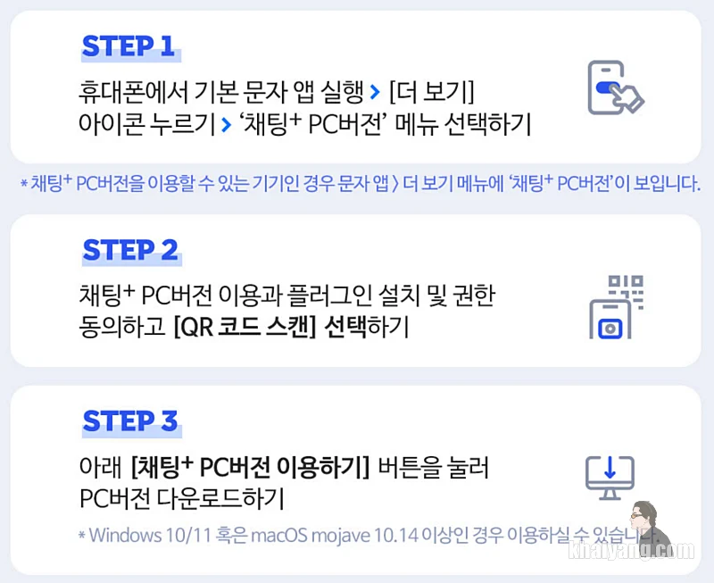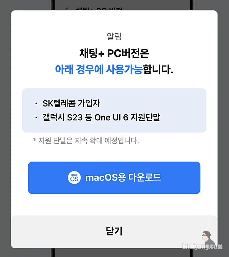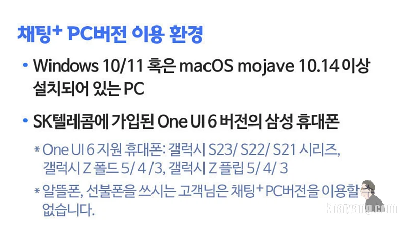 그리고 아쉽게도 알뜰폰, 선불폰을 사용하는 사용자는 채팅플러스 PC버전을 이용할 수 없다고 합니다. 추후에는 알뜰폰 사용자들도 지원을 꼭 해줬으면 좋겠습니다.