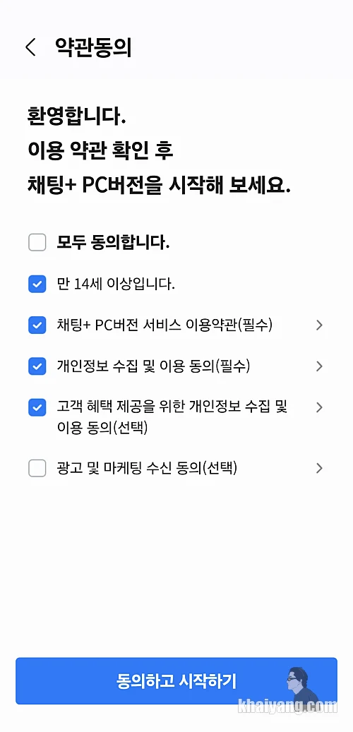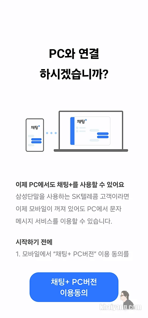 선택을 하고 나면 PC와 연결 할거냐는 화면이 나오는데 여기에서 하단에 있는 채팅+PC버전 이용동의를 합니다.