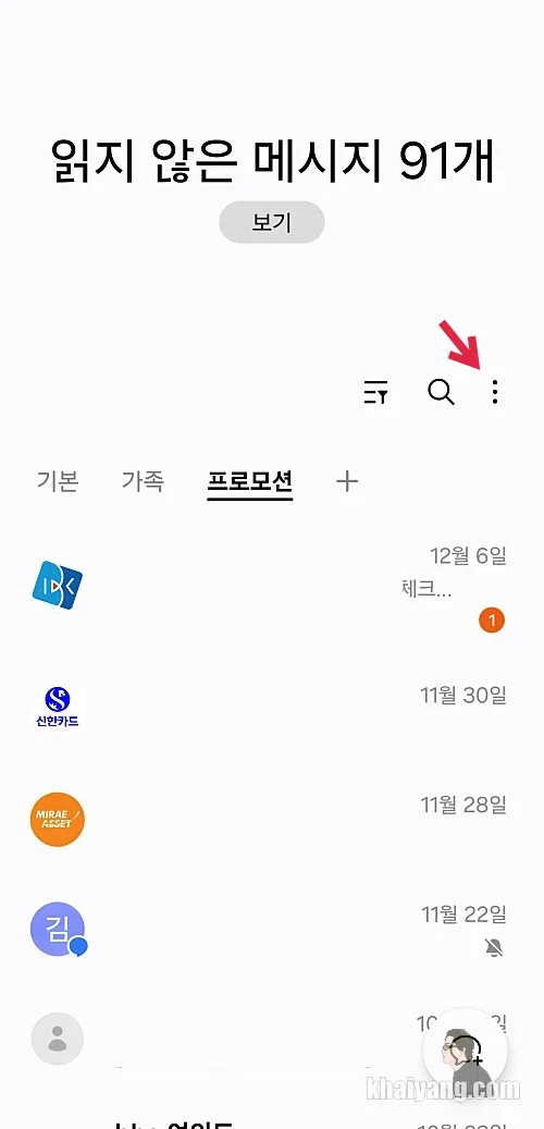 우선 갤럭시 스마트폰의 문자 메시지를 열어서 상단에 있는 점3개를 클릭 합니다.