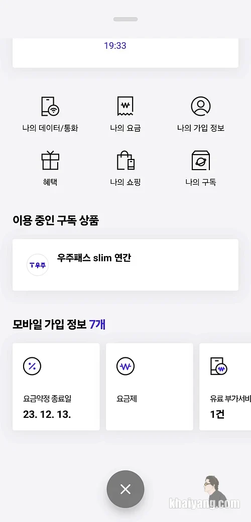 티월드 앱을 열어보고 MY 메뉴 항목을 보면 선택약정이 언제 끝나는지 확인할 수 있습니다. MY 메뉴에서 맨 밑을 보면 요금약정 종료일을 확인할 수 있는데 저는 2023년 12월 13일이 종료일이었습니다.