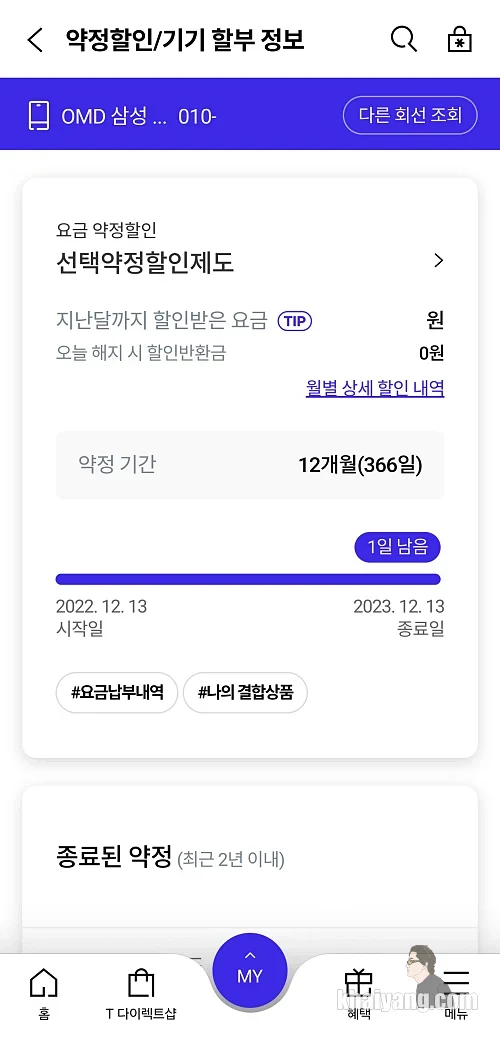 티월드 MY 메뉴를 보면 약정할인/기기 할부 정보에 1년이 연장 된 것을 확인할 수 있습니다. 365일이 아니라 366일이라서 끝나는 날 다음 날부터 가입을 할 수 있습니다.