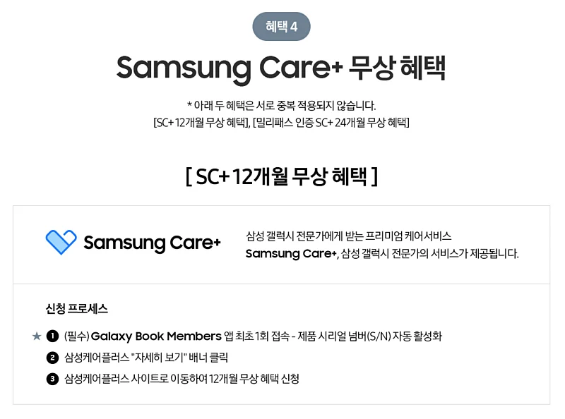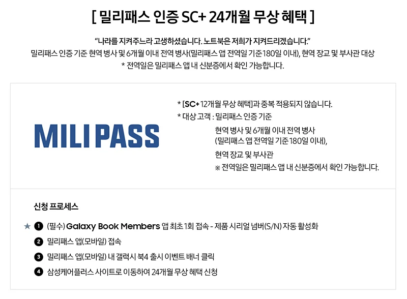 그리고 군인들을 위한 서비스를 제공한다는 것이 마음에 드는데 밀리패스 인증을 하시면 삼성케어플러스 24개월 무상 혜택 신청을 하실 수 있다고 합니다.
