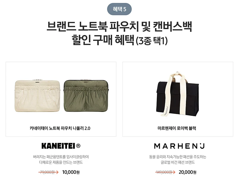 또한 업사이클링 브랜드 ‘카네이테이’의 노트북 파우치(7만 9천원 상당)를 1만원에 구매하거나, 비건 패션 브랜드 ‘마르헨제이’의 로이백(14만 9천원 상당)을 2만원에 구입할 수 있습니다.