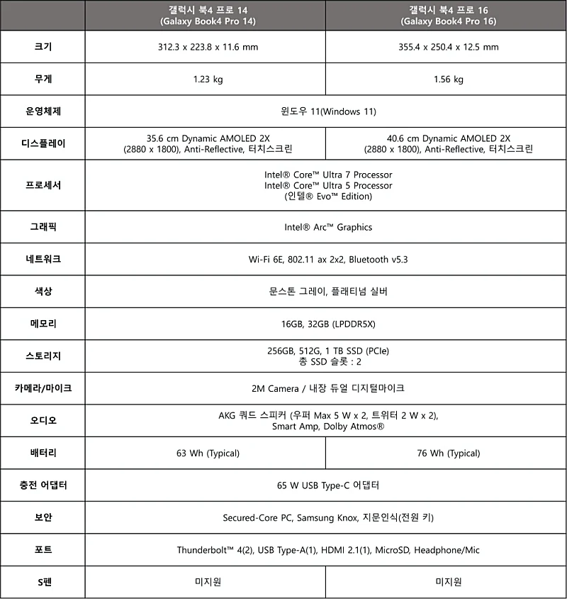 ‘갤럭시 북4 울트라’와 ‘갤럭시 북4 프로 360’은 16인치(40.6cm) 화면, ‘갤럭시 북4 프로’는 16인치(40.6cm)와 14인치(35.6cm) 2종의 화면으로 출시됩니다.