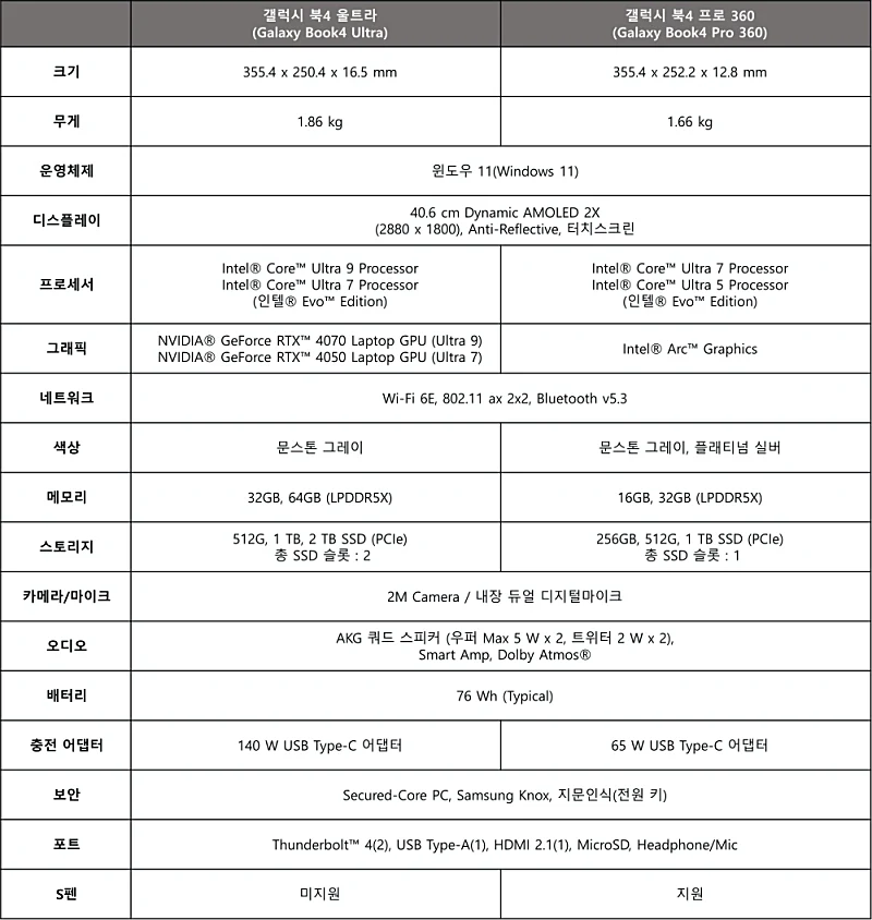 프로, 프로 360 모델은 내장 그래픽(GPU) ‘인텔 아크'가 탑재 되었고, 고성능 울트라 모델에는 노트 PC용 외장 그래픽 ‘엔비디아 지포스 RTX 40 시리즈 4070/4050 이 탑재 되어서 고성능 게임과 그래픽 작업등에 용이 합니다.