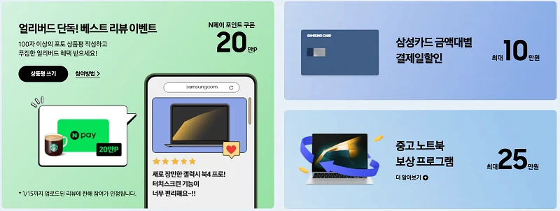 베스트리뷰 이벤트를 통해서 N페이 포인트 쿠폰 20만P를 받을 수 있고, 삼성카드 금액대별 결제일 할인 최대 10만원을 받을 수 있습니다. 중고노트북 보상프로그램 최대25만원도 제공 됩니다.