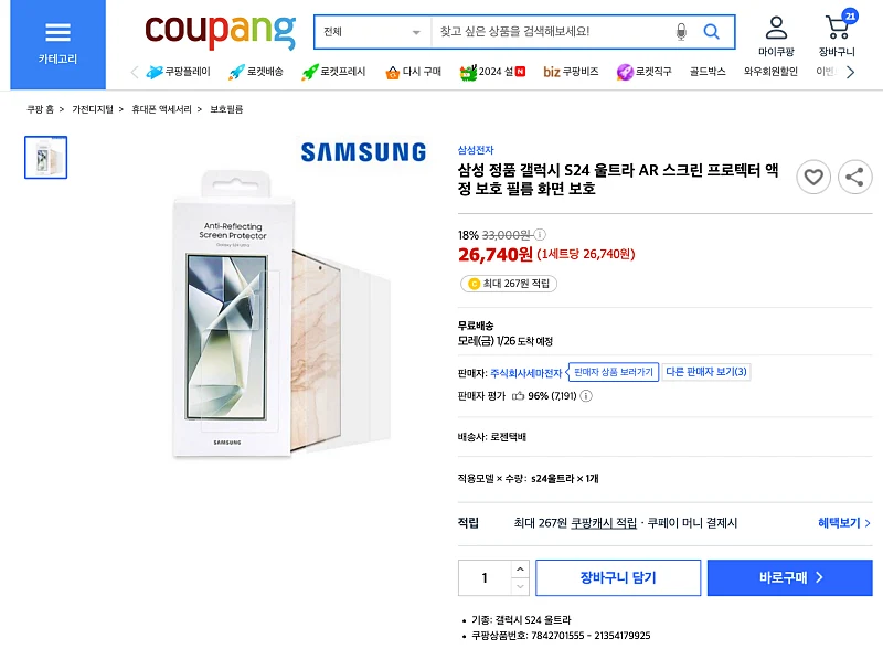 19일 새벽 치열한 접전(?)끝에 갤럭시S24 울트라 1테라(TB) 모델을 사전예약으로 구매 완료 했습니다. 하지만 스마트폰만 산다고 해서 모든게 끝난거는 아닙니다. 그 뒤에 사야할 소소한 것들이 은근히 많은데 그 중에 대표적인 것 두개가 바로 케이스 그리고 보호필름(강화유리) 입니다.
